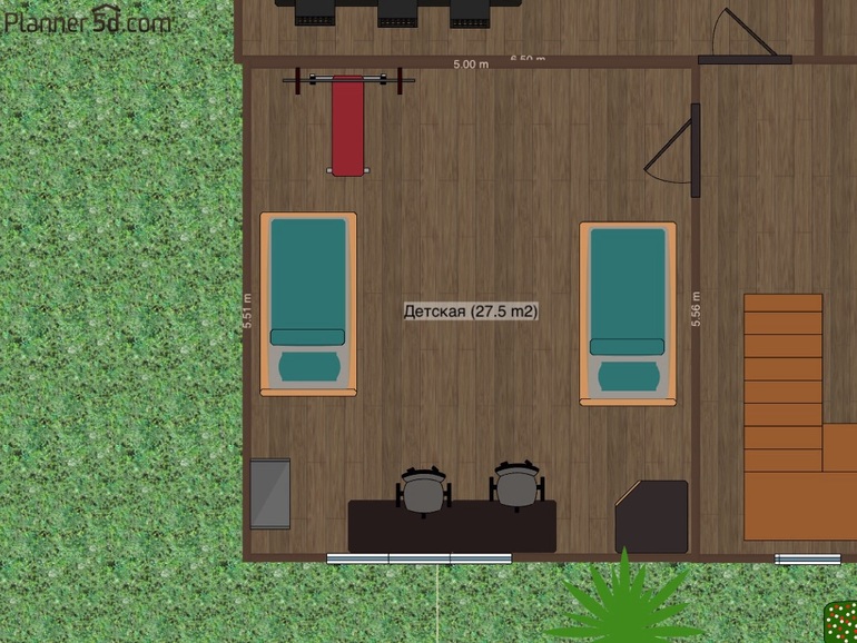 А если кровати поставить в угол где спорткомплекс, под 90 градусов друг к другу. А спорткомплекс на стену где дверь. У окна сделать с двух сторон симметрично стеллажи и между ними столешницу. На окна римскую штору.