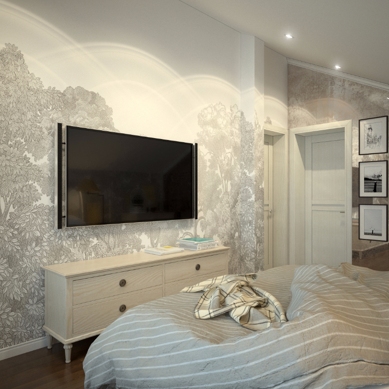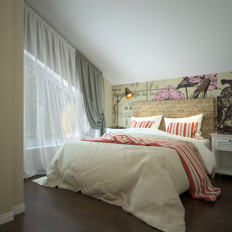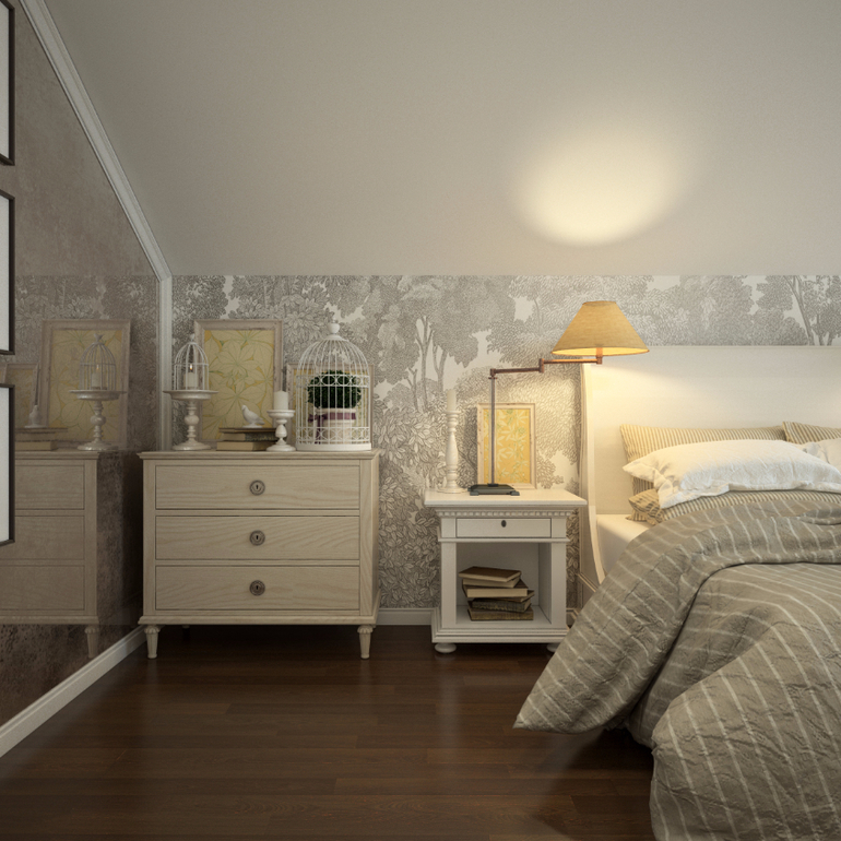 В доме предстояло жить семейной паре и их молодой дочери, поэтому оформление интерьера мы начали со спален. В обеих комнатах были использованы уникальные цифровые обои - они создали эффект роскошных, обитых шелком стен, создали уют и придали интерьеру некоторую будуарность. Для хозяйской спальни было решено предложить сочетание большого состаренного зеркала во всю стену и светлых монохромных обоев с растительным рисунком - это не только поддержало общий стиль, но и визуально увеличило не слишком просторное помещение.