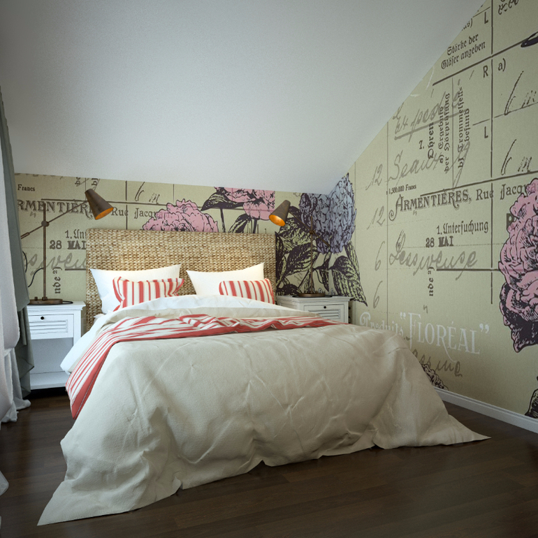 Девичья спальня наоборот была большой, а оттого немного неуютной. Этот вопрос удалось решить использованием приема зонирования, вокруг кровати стены отделаны достаточно темными обоями с крупным рисунком, напоминающим по стилю открытку начала прошлого века, а при входе в спальню стены решено было отдать под покраску в светлых тонах, но в той же цветовой гамме, что и основной фон обоев.
