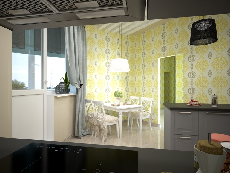 часть кухни на фото ниже (обои только в обеденной зоне, остальные стены под покраску