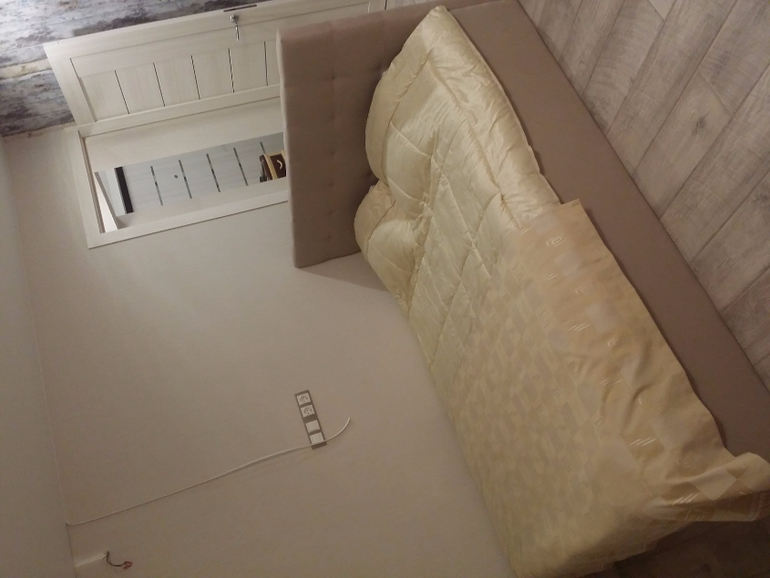 В комнате шторки пока временные, заказала ткань на постоянные, ждемс)) Но пока и так не плохо, как мне кажется. Шнур над кроватью - это плинтус, надо немного подклеить там обои и повесить бра, опять-таки еще не дошли руки. Обои "под драный забор" вызвали много споров у наших родителей, но нам хотелось именно их, увидели и не смогли устоять. Обратите внимание, что на полу у нас брашированный ламинат, имитирующий доску состаренную, а столик будет журнальный из паллет, так что образ должен сойтись.