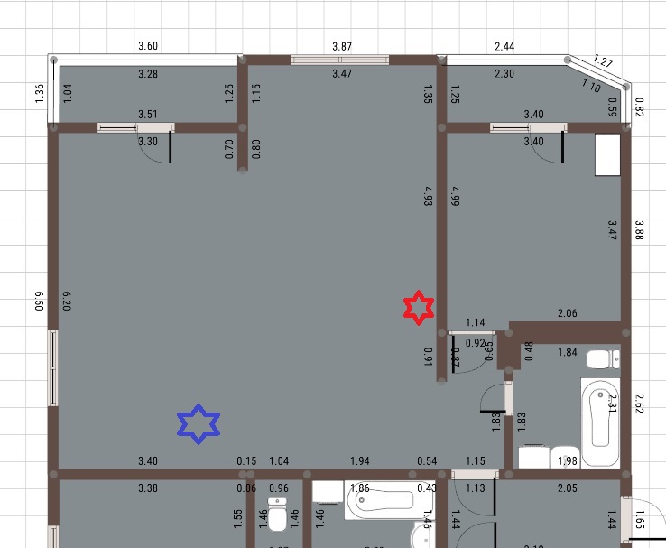 Небольшое помещение справа и есть на данный момент кухня, там трубы водоснабжения, канализации и силовой кабель. Нам нужно перенести кухню с соседнюю большую комнату. Вопрос с канализацией. Муж видит лишь одну возможность - расположить кухню (сами шкафы) вдоль стенки с иней звездочкой и соот-но все трубы подвести из санузла за стеной. Мне не нравится такая планировка ( заходишь и упираешься в мойку ( мне кажется гармоничнее будет выглядеть кухонная мебель у стены с красной звездочкой, но как к этому месту подвести канализацию? вот в чем вопрос..