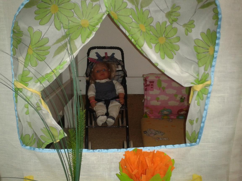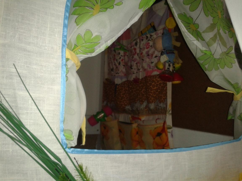 На полу бежевый ковролин и детский Аришкин матрас (сама притащила и сказала, что тут теперь его место). Спрятали туда каляску. Еще есть кармашки для всякой мелочи.