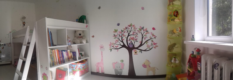 В детской специально брали детскую нетоксичную краску и устойчивость ее к мойке соответственно хуже. Гуашь например до конца не оттерлась, НО капля краски и все как новое