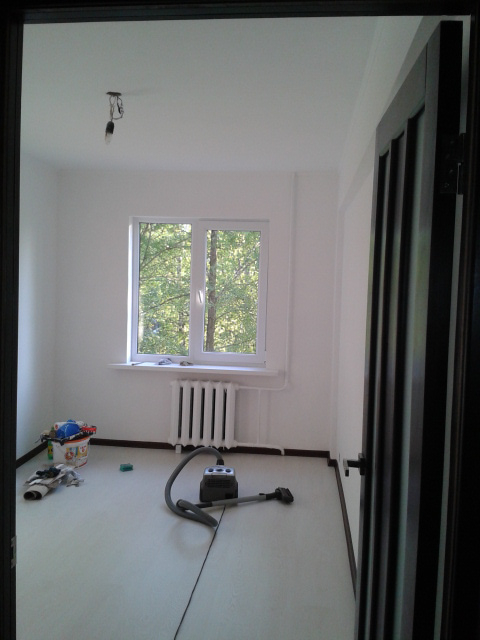 Полы деревянные. Стены бетонные, неровные. Разеток 2шт. на стандартной высоте 95см на стене справа. Добавим еще одну на стену слева и перенесем имеющиеся на 15см. от пола. Выключатель перенесем на стену слева от двери и опустим на удобную для ребенка высоту (90см. от пола).Будем выравнивать потолок, стены штукатуркой+шпатлевкой. Затем красить в белый цвет специальной краской для детских комнат Альпина.