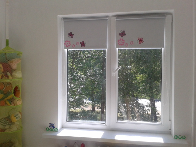 На окнах ролл-шторы с отражающей солнечные лучи внешней стороной. За счет этого цвет не белый, а серый. Украшены наклейками.
