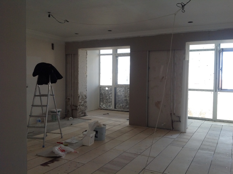 Здравствуйте! Имеем: гостинную совмещённую с кухней и 2-мя лоджиями общей площадью, более 30 кв. м.