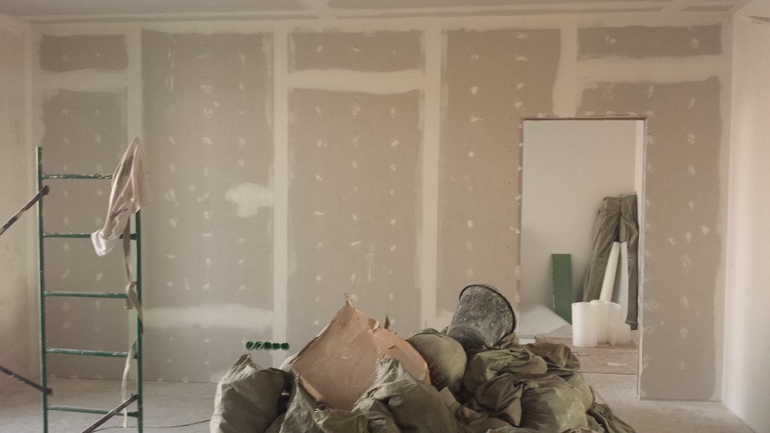 2. Основной цвет стен гостиной- бежевый, рамки на ТВ зоне выкрашиваются в цвет стены, молдинги на проёмах делаем белого цвета, плинтус белый, дверь белая.