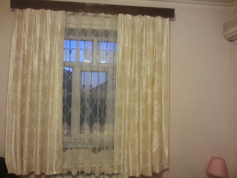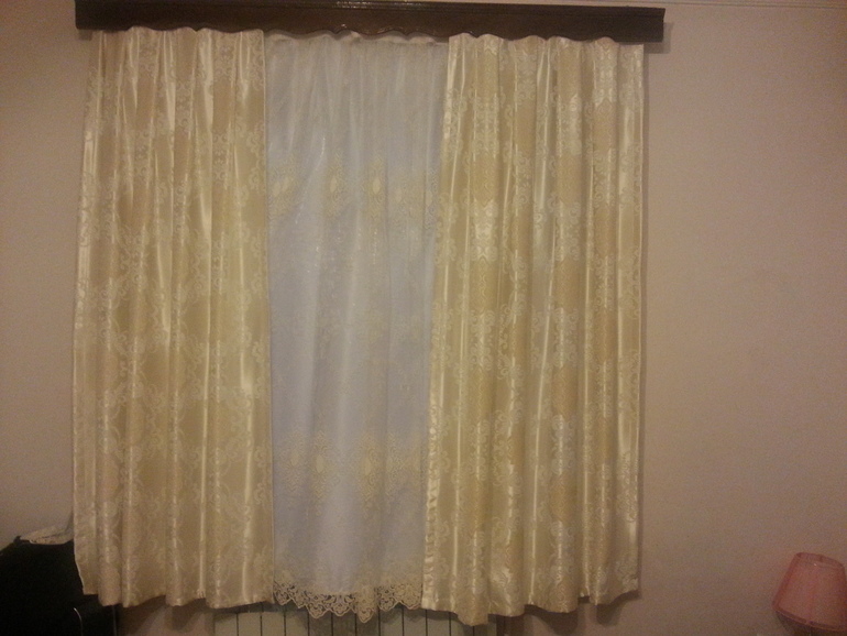 Портьеры сами по себе очень богатые, я бы к ним тюль добавила однотонную без вышивки