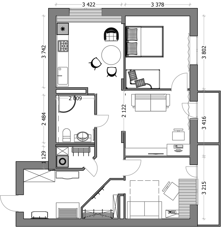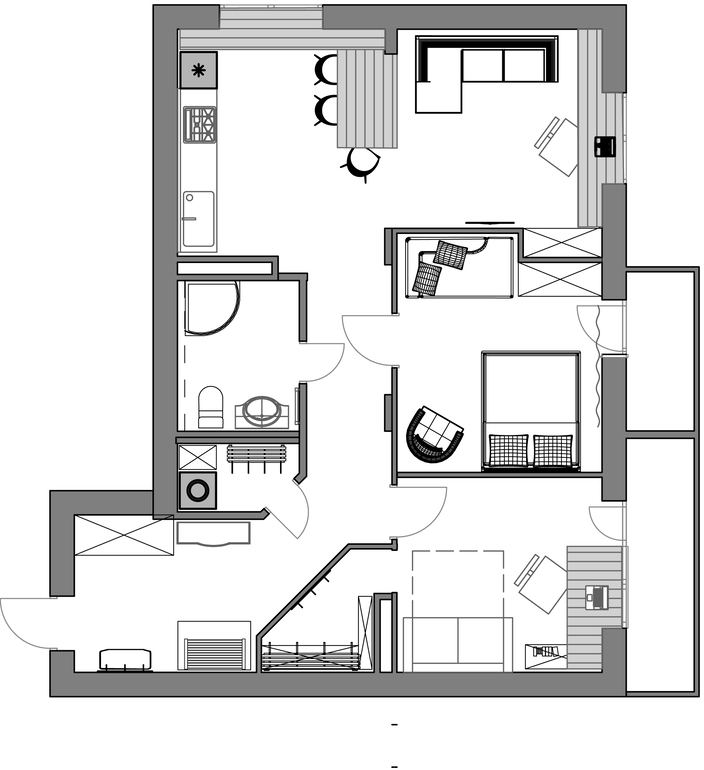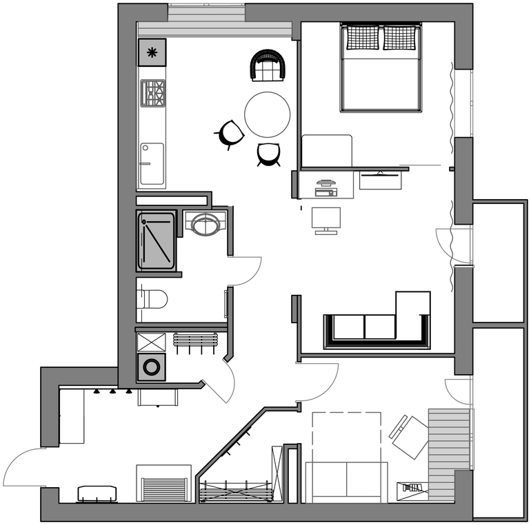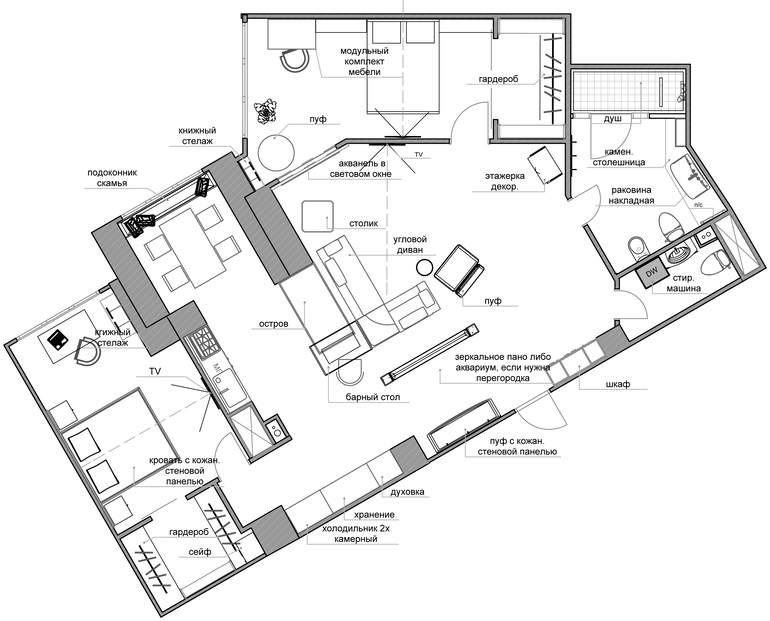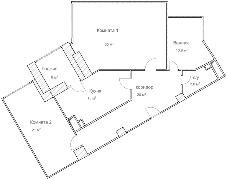 Квартира для молодого человека 30 лет. Студийный тип, две спальни. Для постоянного проживания имеется дом за городом. Квартира будет служить для ночевок на неделе.