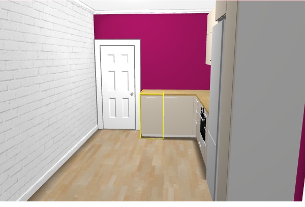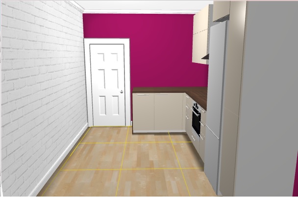 Хочу покрасить фартук (под прозрачным стеклом) и одну примыкающую стену (где будет висеть телевизор) в яркий ягодный цвет, ближе к баклажановому. Противоположную стену хотелось бы выложить светлыми гипсовыми кирпичиками, повесить аксессуары в цвет фартука и светильники двунаправленные. Напольного покрытия пока тоже нет.
