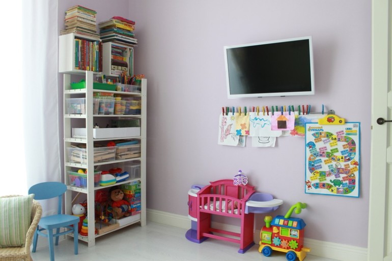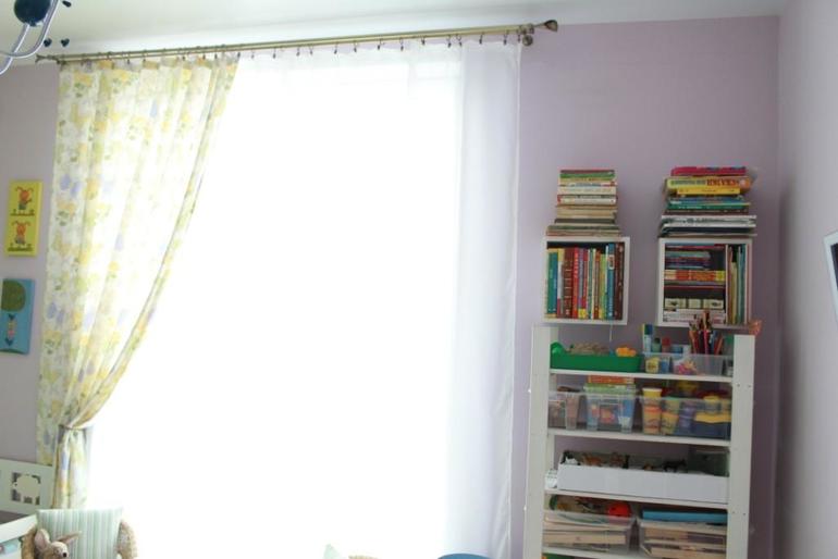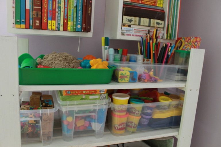 Стеллаж был найден возле мусорки, покрасила, пока служит для развивашек и прочего, икеевские коробки очень удобны, в них видно, что где лежит с высоты роста ребенка, но конечно придают некую захламленность. В дальнейшем буду что то придумывать другое.