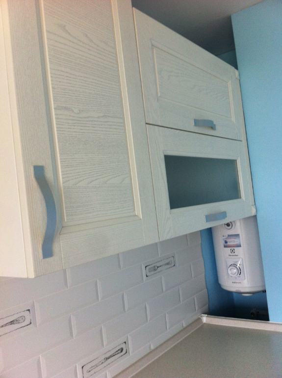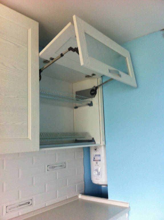 Интересное решение, подумала там два подъемника (т.к. 2 ручки) ан нет ))). А как там крайний верхний шкафчик с сушкой держится? Очень красивая кухня! Кабанчик и нежный цвет фасадов делают свое дело.