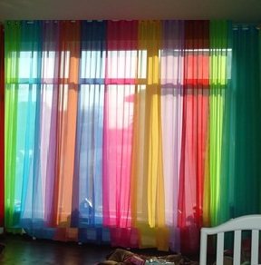 Идея объединения стувы и кровати родилась такая по цвету. Идею подкинула подруга - завязать все текстилем, шторами. Шторы из разноцветных полосок вуали, типо радуги.