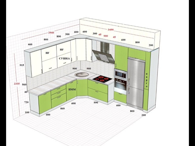 На самом деле,трапеция "крадёт" 30 см полезной площади,лучше сделать прямой угол). А почему колонка под духовку и холодильник меньше по глубине,чем столешница? Ещё не нравится "забор" из верхних шкафов слева.) А в целом- неплохо!!!)