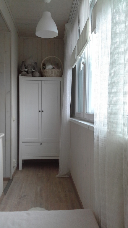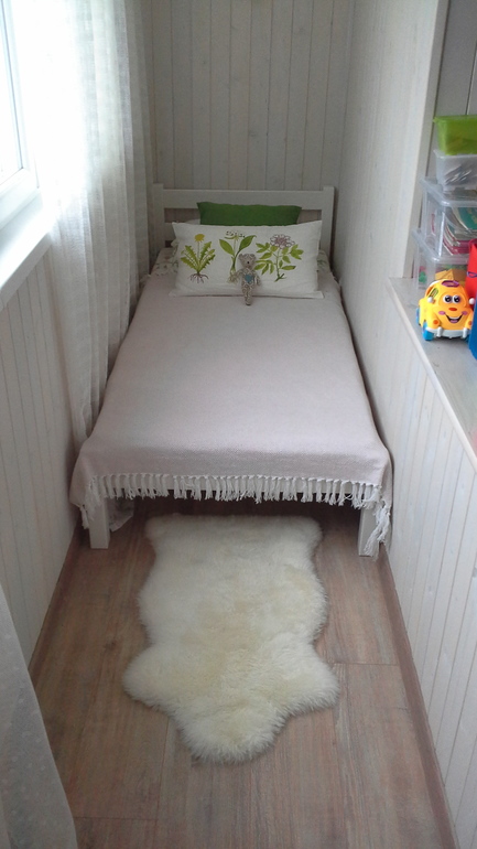Утеплили лоджию и решили туда поставить кровать, сейчас там очень классно, посмотрим, что будет зимой, если что повесим конвектор или перенесем кровать в комнату. Еще не повесили шторы, хочу эту ткань