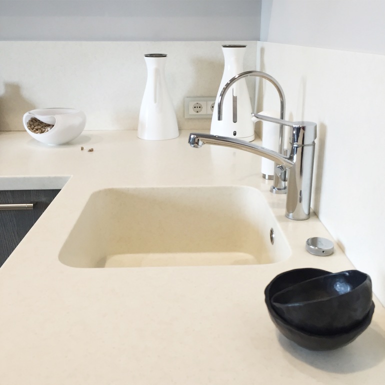 Смеситель Hansgrohe. Интегрированная мойка из искусственного камня, очень удобна в уборке.