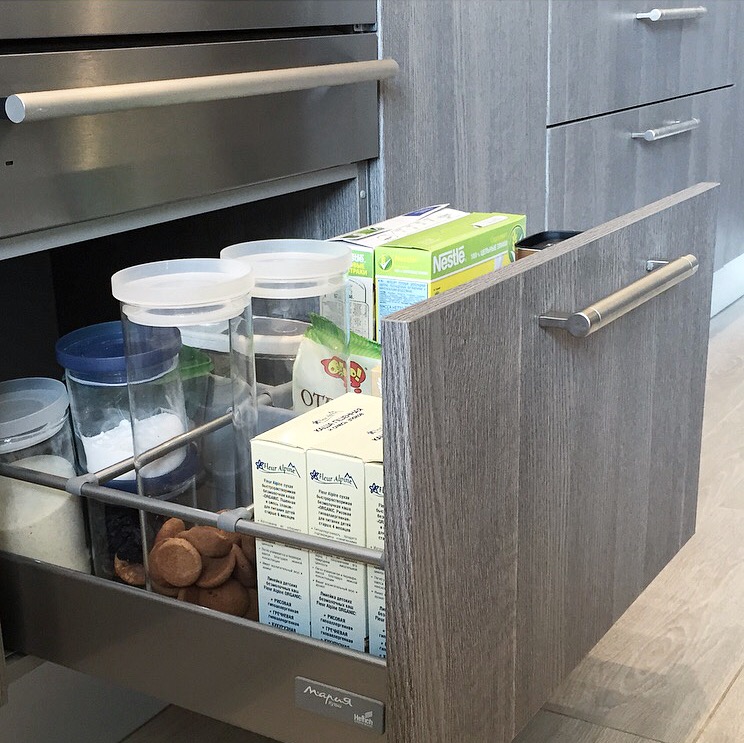 Еще левее выдвижная панель с крупами. Очень удобное хранение: все крупы хорошо просматриваются, видны запасы, к любой удобный доступ, красиво и функционально, не говоря уже о колоссальной экономии места! Сын сам достает свои любимые макароны со звездами, соседние баночки (IKEA) не падают). Внешняя ширина выкатной дверцы 14,5 см, внутренняя/полезная 8,5 см