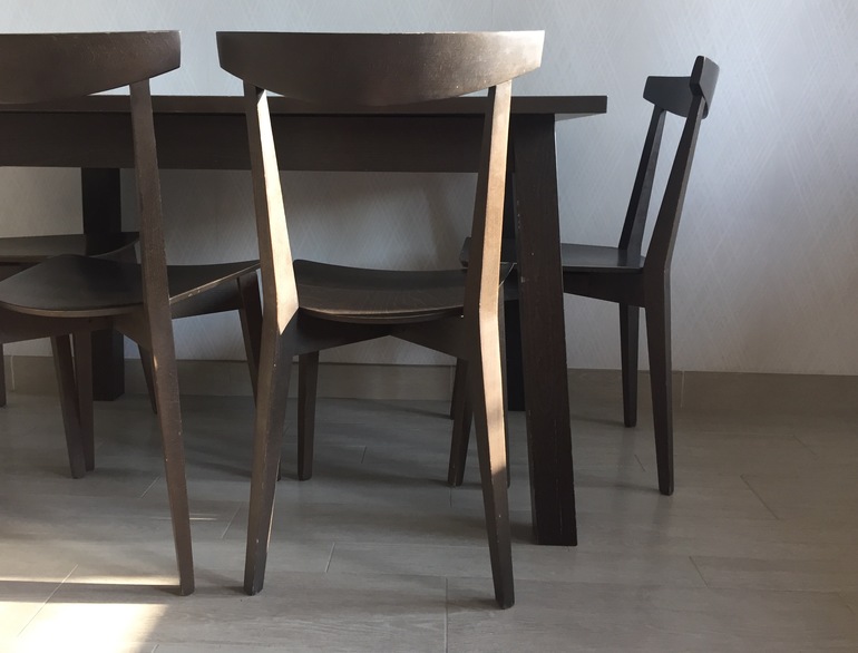 Cтоловая группа фабрики "Мария", модель Mambo, облицована шпоном дуба, стол раскладной. На полу глазурованный керамогранит.