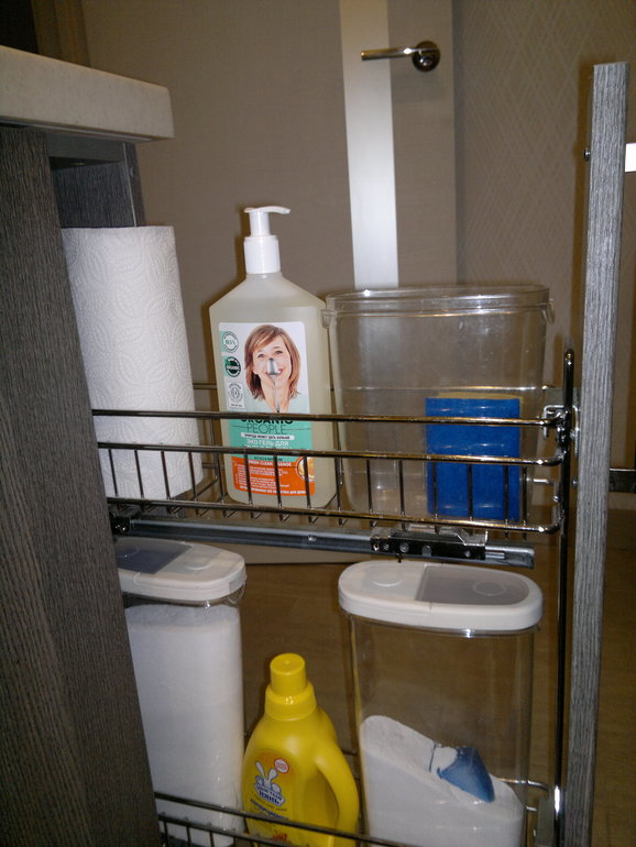 Завершающая секция для предметов к которым нужен быстрый доступ: порошок, средство для мытья посуды, бумажным полотенцем, губкой.