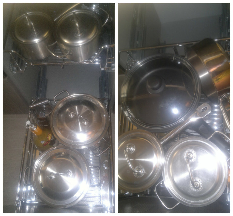 Слева - большое отделение для хранения кастрюль (Гурман профи, ни на какие другие не променяю! Верхняя полка выдвигается. Там же, внизу, терка, наверху дуршлаг