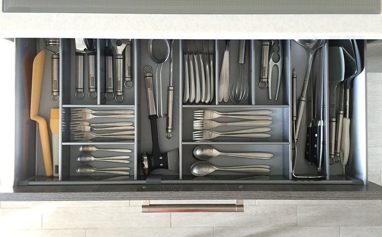Расположен под индукционной панелью - приборы не нагреваются! Незначительный нагрев происходит лишь при длительной работе варочной поверхности. Набор столовых приборов + 2 большие салатные ложки Auerhahn, прочие Tescoma, изготовлены из стали 18/10. Подложка - очень симпатичный непромокаемый коврик. Удобно, что секция широкая, приборы не стесняют друг друга.