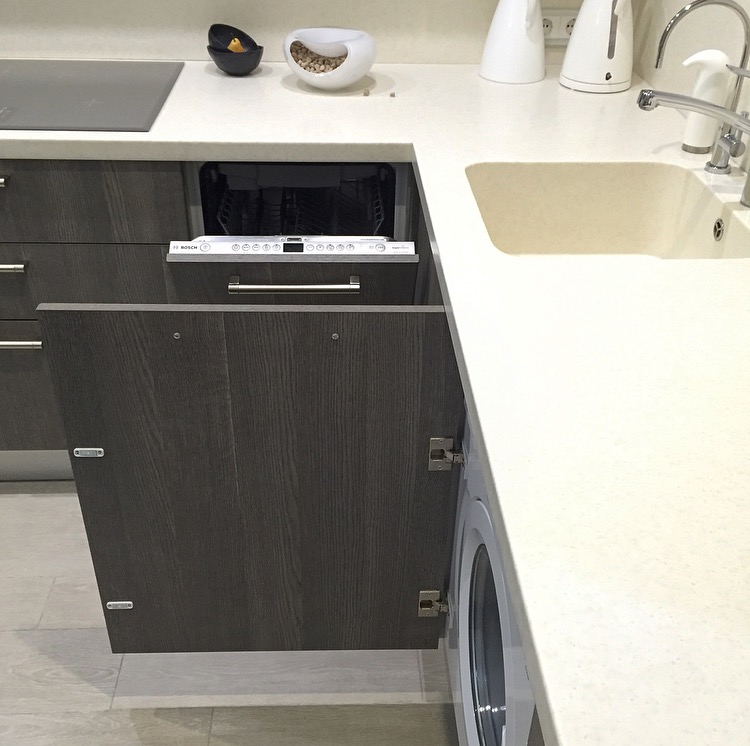 Правее от варочной поверхности - посудомоечная машина Bosh, секция с мойкой, стиральная машина Bosh.