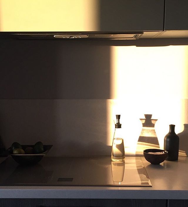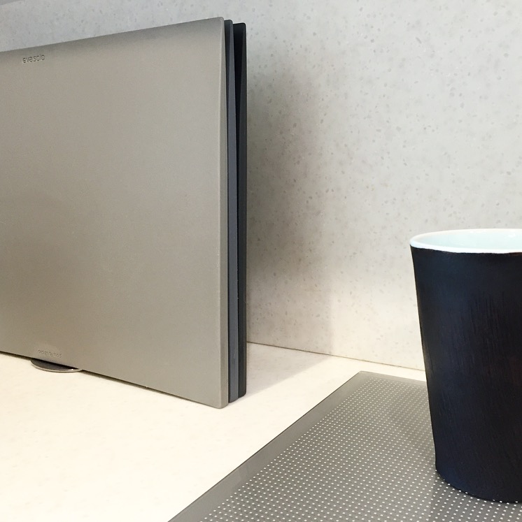 Разделочные доски Eva Solo, поделены по цветам: самая темная - мясо, рыба, средний оттенок - овощи, светлая - хлеб. Стакан ручной работы (молочный обжиг) Iceland Home.