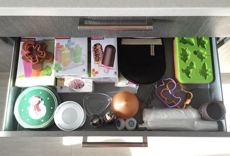Та же подложка, выручала ни один раз - когда, "что-то" решает "убежать", то первым делом направляется по стенкам всех ящиков. В баночке Tescoma с белой крышкой - соль, в зеленой жестяной баночке Villeroy & Boch - храню испеченное печенье, сейчас там формочки, коты - перечница и солонка. Силиконовые формы для выпечки HABA, подставка под приборы Tescoma, силиконовые формы для яичницы Tescoma (использую так же для каши), прихватки/рукавички с вшитыми магнитами Le Creuset, контейнер для лука и две машинки для яичницы Fackelmann.