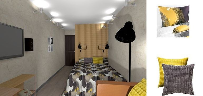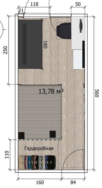 Больше чем планировка мне не нравится цветовое решение. Какое то оно обыденное и скучное. По планировке: я бы предложила кровать 140см шириной. К кладовке поставить софу 160см напротив нее стол/тумбу для работы с компом. Вариантов удлбных полно. на поворотный выдвижной кронштейн к стене подвесить тв. В плотную к столу-тумбе кровать. Тогда останется проход к балконной двери. ТВ можно будет смотреть как с софы так и с кровати. Появится пожлюие зонирования.