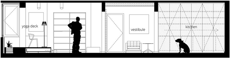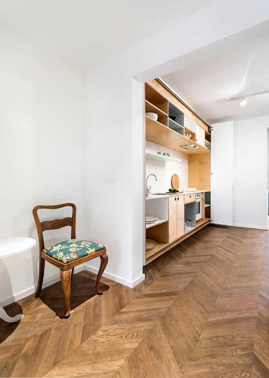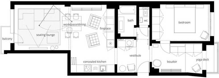 Новая планировка делит квартиру на гостиную и личную (спальную) зоны. Прихожая была увеличена за счет вспомогательных помещений, а бывшая кухня была превращена в гардеробную. Новая кухня располагается слева от входа и примыкает к гостиной.