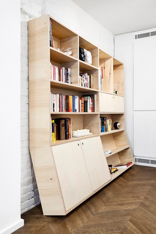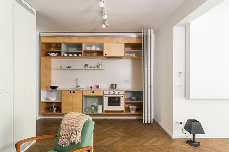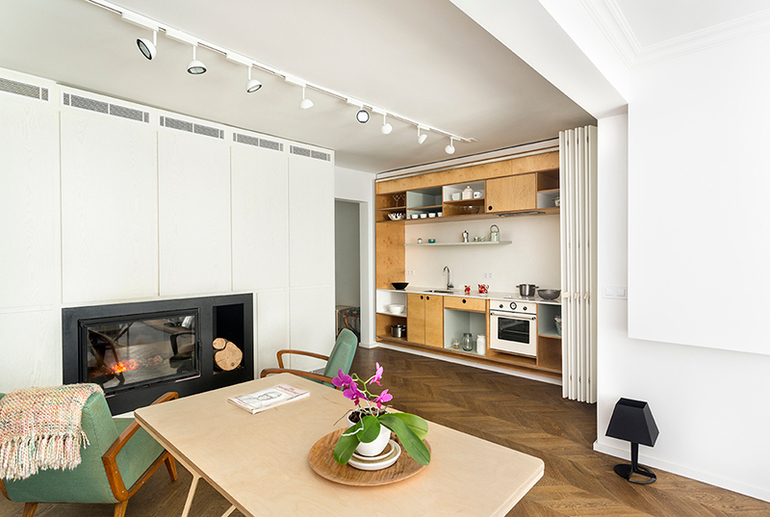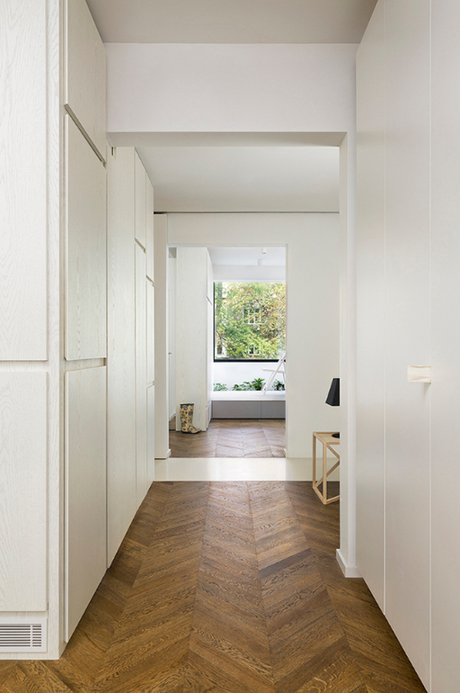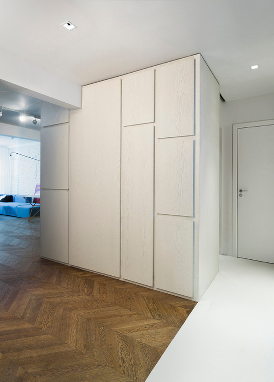 Интересно, что большинство функциональных зон скрыты от посторонних глаз. Например, сложно догадаться, что за строгими фасадами шкафа в прихожей скрывается стиральная машина, а встроенная кухня размещается за раздвижными дверьми. В большом белом шкафу в гостиной располагается не только встроенный камин, но также холодильник и кондиционер. Все эти системы хранения, которые, казалось бы, должны были «утяжелить» интерьер, напротив, сделали его более воздушным и легким за счет своего грамотного расположения и белого цвета.