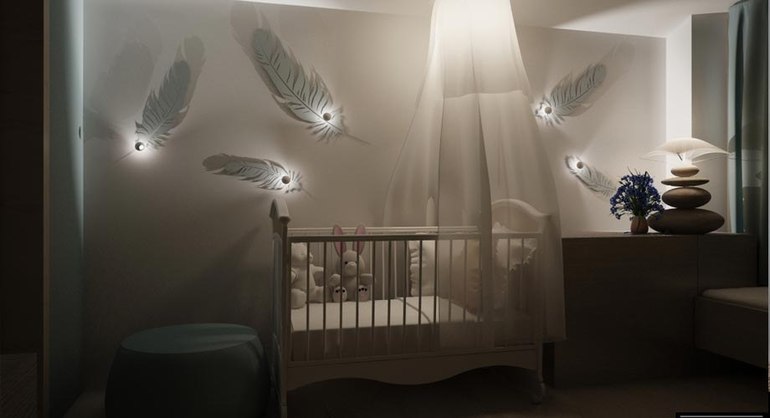 Перышки вырезать из фанеры и покрасить. Привентить лампочку. Жирафы сидят на полках,оформленных диодной лентой