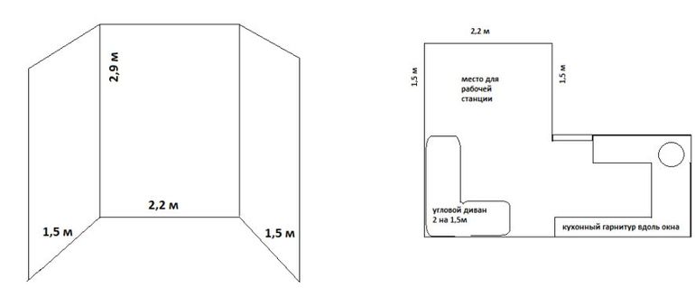 На изображении слева - вид части комнаты в перспективе. Справа - план.