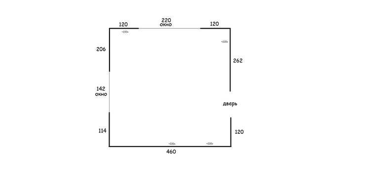 Размеры указаны в см, также на рис. обозначены расположение розеток (~220v).