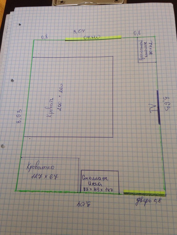 Перед покупкой кровати я пол в комнате мерила и скотчем бумажным намечала куда кровать влезет и как смогу другую мебель поставить