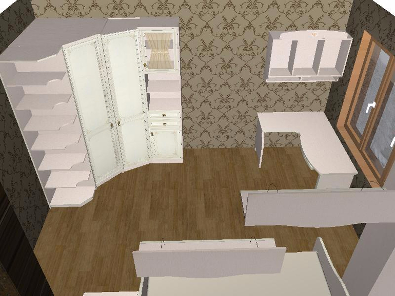 В стеллажи можно купить "вставки" ящики/корзины... пока под игрушки, в дальнейшем для учебников... Над столом повесить полку. На легкое кресло сделать подушку (цветовой акцент к шторам и обоям), на тумбочку при кушетке настольную лампу "аля прованс" И такая комната может служить очень долго. Я против всяких шкафов и полок над кроватями... Да, можно сделать красивую инсталляцию из рамок и зеркал (позже, а пока просто сделать постеры, которые интересны ребенку) Но это мое представление:) Вам предлагаю просто как вариант, который накидался за 20 минут.