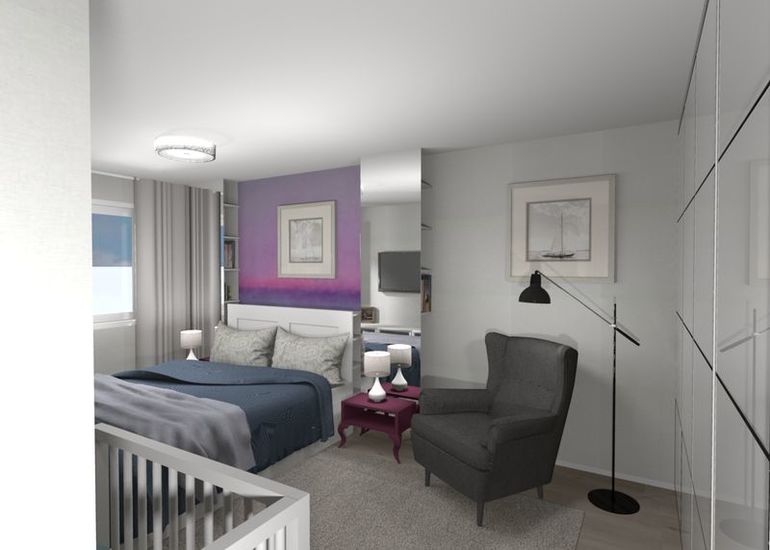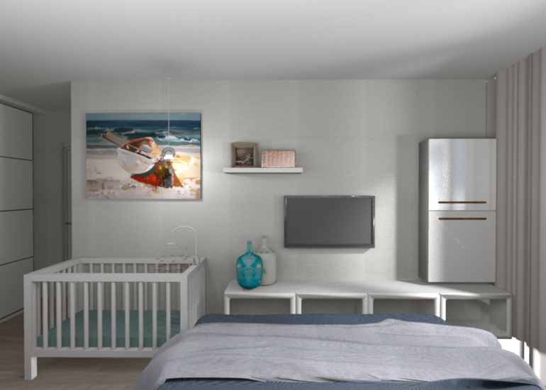 я бы наверно сместила кровать ближе к шкафу и убрала такое изголовье с полочками. Соответственно кроватку детскую передвинула к взрослой кровати со стороны окна. По опыту, кроватка первые месяцы все равно рядом с мамой стоит. А в остальном мне понравилось. Может еще чутка зелени добавить, в смысле цветы.
