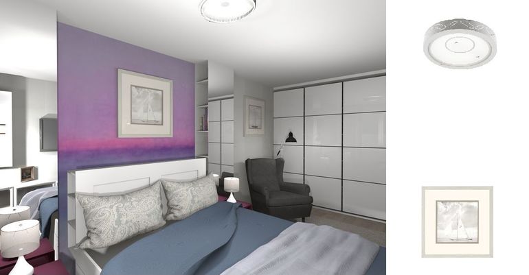 В целом понравилось)Но у изголовья кровати слишком много всего. И градиент, и картина, и зеркала, и полки, и тумбы, и торшеры... Ну прям перебор для глаза.