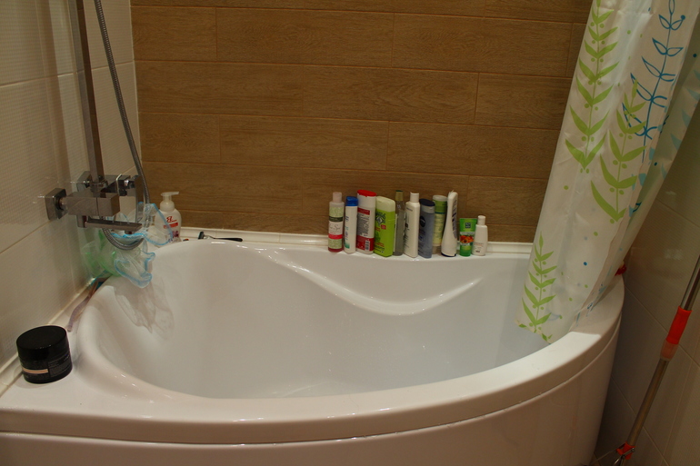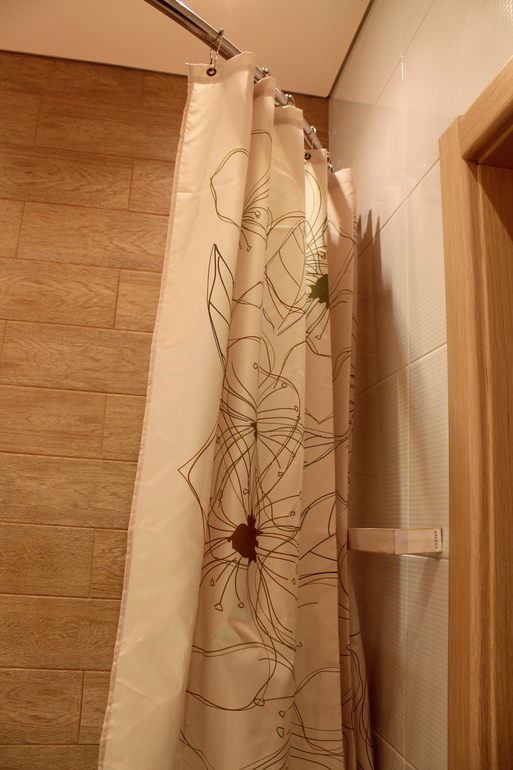 Шторка и держатель для полотенец (а так же стаканчик для щеток и мыльница, которые мы до сих пор не повесили, они настенные, парочка ковриков, которые убрали на время продолжения ремонта) я заказывала в интернет магазине, кому интересно могу подсказать.