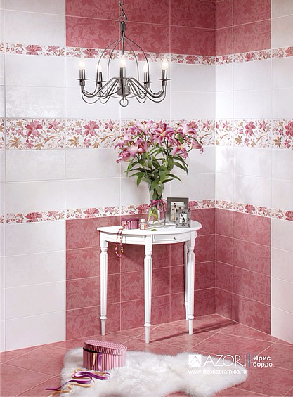 у меня в прошлой квартире в ванной была плиточка ирис.В двух цветах.Одна стена полностью бардовая,остальные выложены комбинированно.Круто смотрится и в уходе качественная плитка,никаких разводов и налета.Протирала оч редко.Фоток к сожалению нет