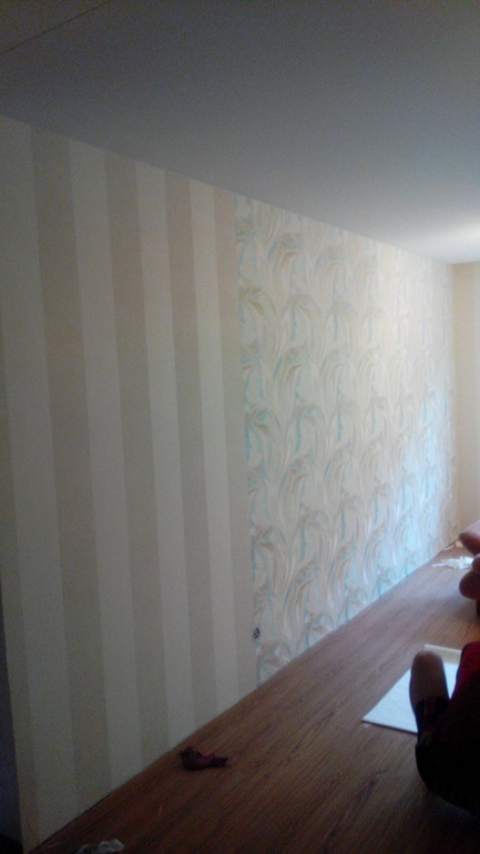 Интерьерное решение гостинойИмеется гостиная-кухня. Сделали косметический ремонт. На всех стенах обои желтоватые в полоску и на кусочке стены(параллельно кухонному гарнитуру) обои с узором. Цвет кухни фото прилагаю. Подскажите: