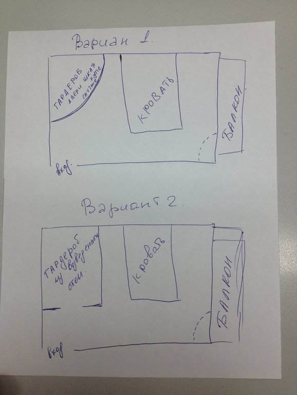 Думаю, можно так сделать: раз хочется простора, раздвижные стеклянные двери на всю ширину комнаты ( 3шт. ,примерно, по 1м), они отгородят гардеробную от спальни и создадут иллюзию глубины. Размеры комнаты прикинула сама по фото. И входные могут открываться внутрь, все зависит от длины гардеробной.