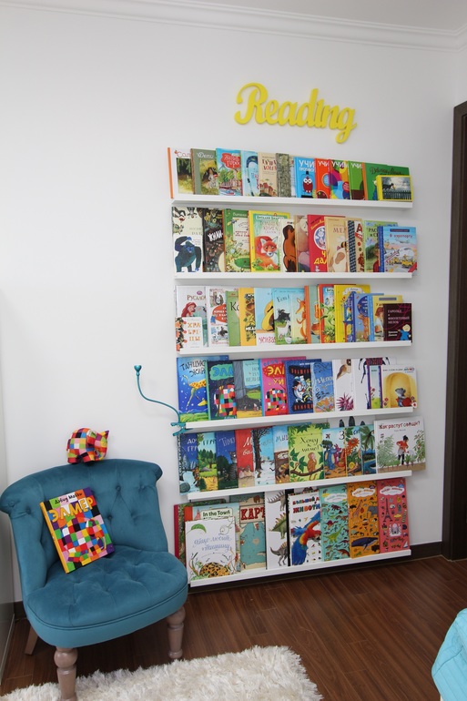 Основная часть книг разместилась на полках Рибба, что очень удобно, тк ребенок видит обложку книги. Рядом стоит кресло и лампа Икеа на зажиме Яншо.