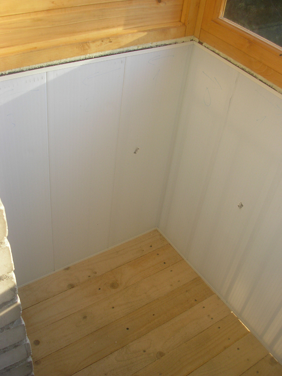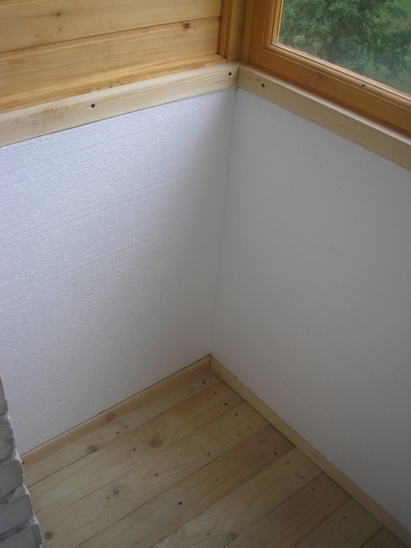 Утепляли пенопластом, на пол толщиной ок. 5-7 см, на стены пенопласт толщиной 2 см. На пол сверху доски, подложка под ламинат и сверху линолеум. На стены деревянная вагонка.