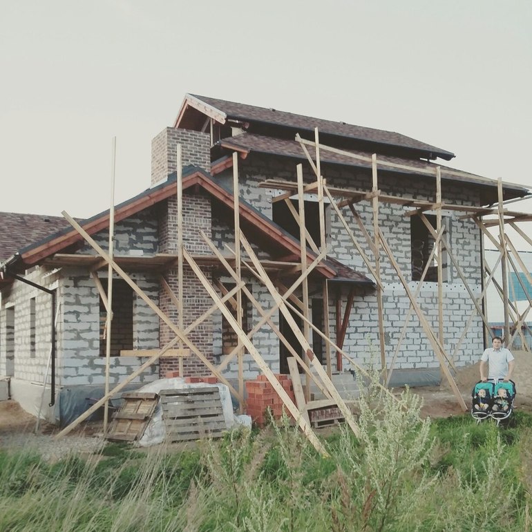 Фундамент, куда же без него. Заливали плиту. Попали, кстати, на не очень приятный момент, наш участок оказался в яме и на песчаной почве. Поэтому, во-первых, привозили много машин с грунтом, а во-вторых, не получилось сделать по периметру сваи. Перекрытие и лестница бетонные. Между вторым и мансардой я захотела деревянный потолок с балками по типу такого, так что пока не трогаем. Кстати таким же будет потолок в одноэтажной части дома. Это кухня-столовая-гостинная.