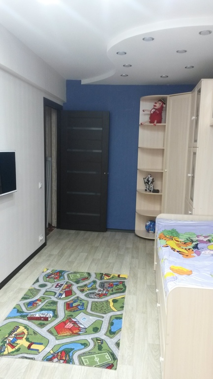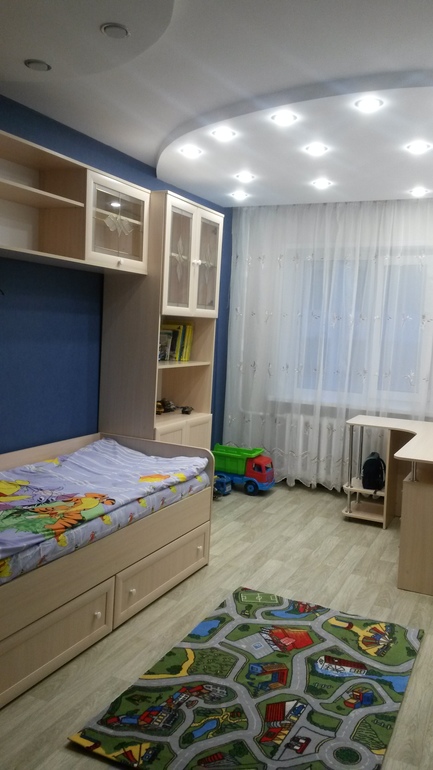 я бы взяла за окнову на шторы синий со стен ,есть шторы не однотонные , а с рисунком, вот их бы. А покрывало, может быть любым в принципе.