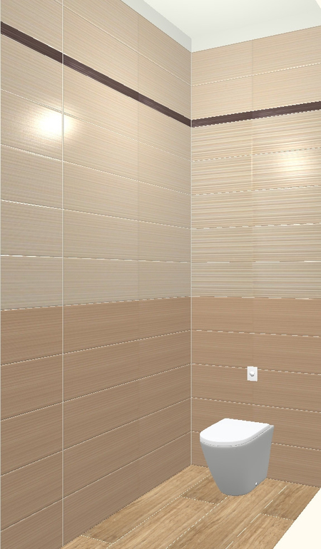 В туалете хочется облегчить низ, можно четвертый ряд от пола сделать либо полосками, либо светлой плиткой. Или вариант такой: от пола светлая, 2 темный, светлая, темная, дальше как у вас.