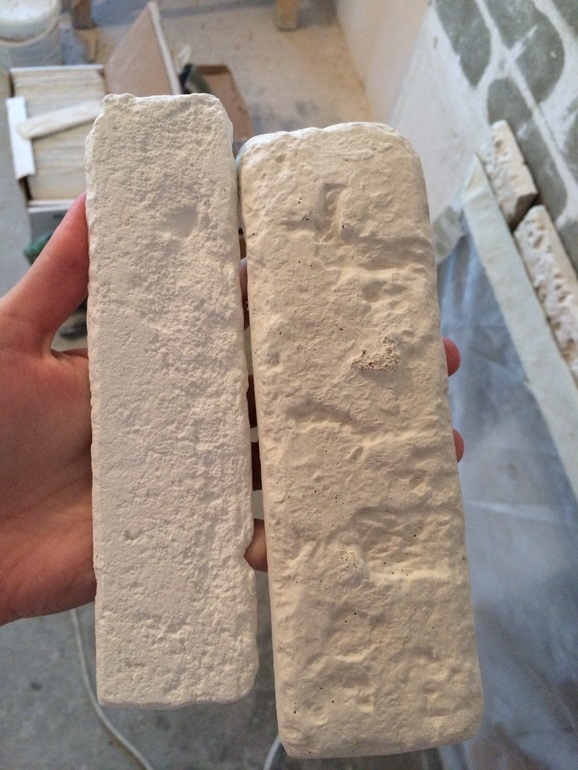 Интерьерные штучки.Я снова со своими кирпичами. Помогите определиться, какой выбрать? Гипсовый или цементный? Гипсовый на фото белый слева. На втором фото гипсовый справа. Он тоненький, но класть легче его. Какой симпатичнее?