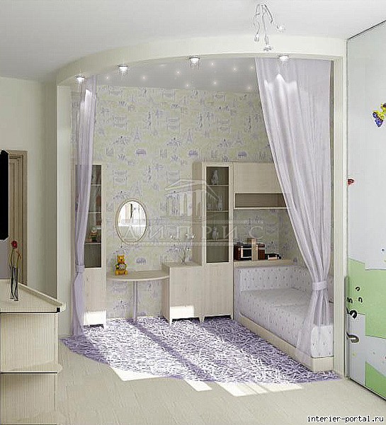 Повесьте просто полукругом шторы с прихватами на потолочный карниз, мне кажется будет очень хорошо для для девочки.